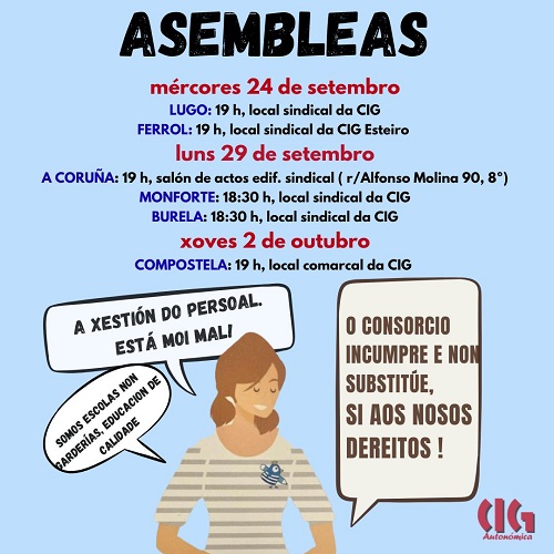 A CIG convídache a asistir ás asembleas o 24 de setembro en Lugo e Ferrol, o 29 de setembro na Coruña, Monforte e Burela, e o 2 de outubro en Compostela. Proximamente informarémosche das asembleas que estamos a preparar noutras localidades.