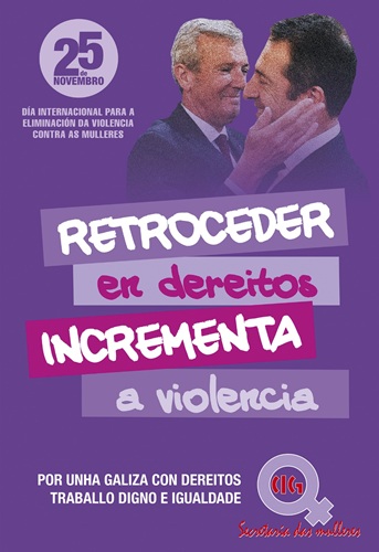 Baixo o lema «Retroceder en dereitos incrementa a violencia. Por unha Galiza con dereitos, traballo digno e igualdade», a Secretaría das Mulleres da CIG acusa ao Goberno do PP na Xunta de Galiza de amparar comportamentos machistas.