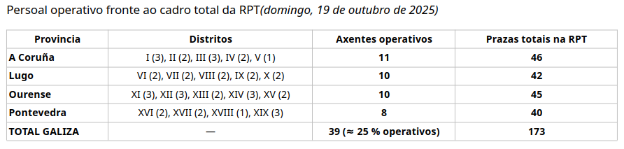 A Consellería, ademais de non reforzar o servizo activando o período extraordinario, mantén sen cubrir prazas vacantes e amortizou postos durante anos, o que provoca que contemos apenas cunha parella de axentes por distrito ambiental durante os fins de semana e festivos. Isto ocorre nun país onde se pode practicar a caza en mais do 80 % da superficie e existen arredor de 35.000 licenzas de caza activas.