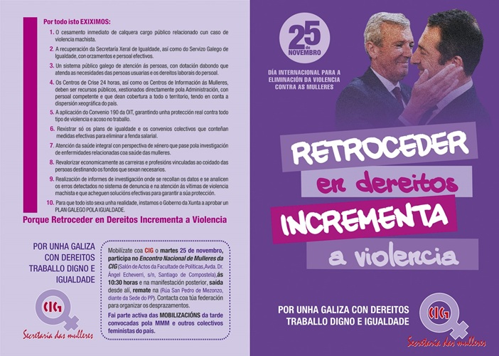Baixo o lema «Retroceder en dereitos incrementa a violencia. Por unha Galiza con dereitos, traballo digno e igualdade», a Secretaría das Mulleres da CIG acusa ao Goberno do PP na Xunta de Galiza de amparar comportamentos machistas.