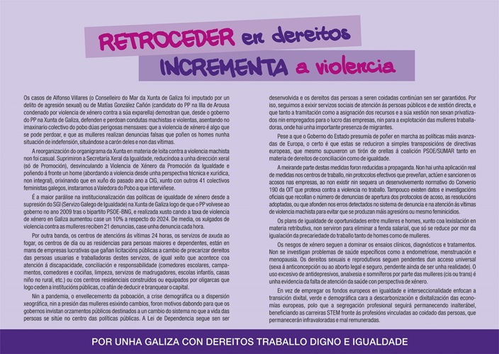 A Secretaría das Mulleres da CIG advertiu que o desmantelamento das políticas de igualdade e a tolerancia de condutas machistas desde o poder que ostenta o PP, transmiten mensaxes perigosas que normalizan a violencia e deixan ás mulleres máis desprotexidas. Neste senso, aseverou que quere denunciar estes retrocesos, esixir responsabilidades políticas e reclamar servizos públicos, igualdade real e protección efectiva para todas as mulleres na Galiza. Non importan as leis se estas non se executan. Non abonda introducir epígrafes nos orzamentos dirixidos á igualdade se ao final se opta polo lucro derivado da privatización de servizos esenciais que deberían ser universais.