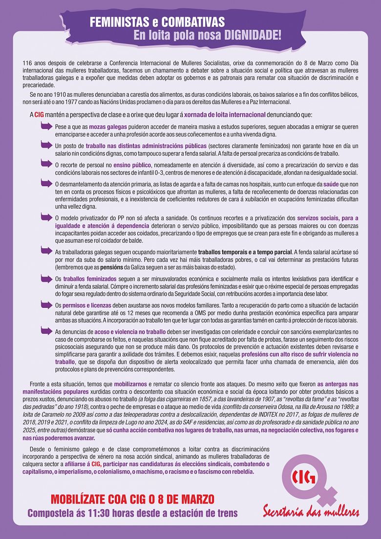 Este ano, a CIG conmemorará o Día Internacional das Mulleres Traballadoras baixo o lema «Feministas e combativas. En loita pola nosa dignidade!», reivindicando a perspectiva de clase e a orixe que deu lugar a esta xornada de loita internacional. Nesta ocasión, a central sindical convoca unha manifestación nacional de mulleres en Santiago de Compostela, que sairá ás 11:30h da estación intermodal, para evidenciar ese feminismo de clase e de País.