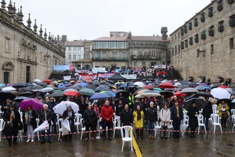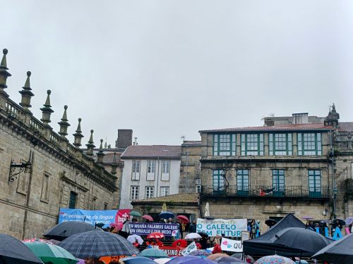 «Na Galiza en galego» foi o clamor que se escoitou na mañá de sábado chuvioso do 14 de marzo na praza da Quintán de Compostela.